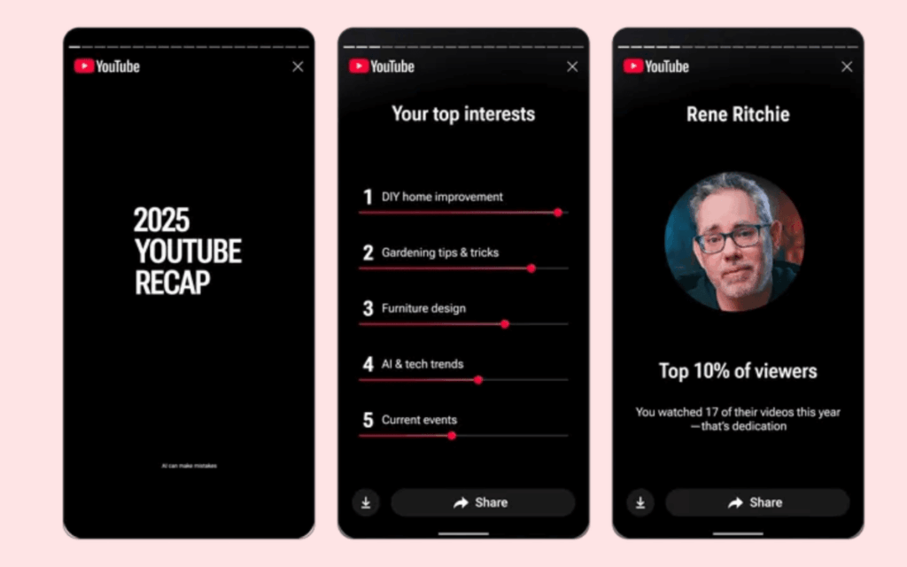 Recap is available starting today for YouTube users in North America, with a global rollout coming this week. Users can find their Recap directly on the YouTube homepage or under the “You” tab. Recaps are accessible on mobile devices and desktop.